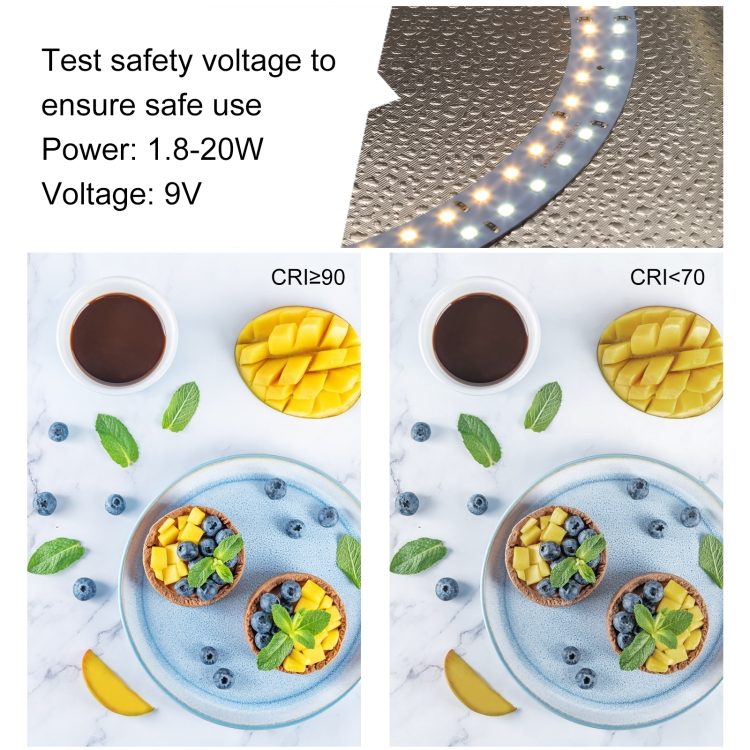 - ფერთა გადაცემა (CRI): CRI90+ ან CRI95+, რაც ფოტოებზე ფერების მაქსიმალურ სიზუსტეს და ბუნებრიობას უზრუნველყოფს.